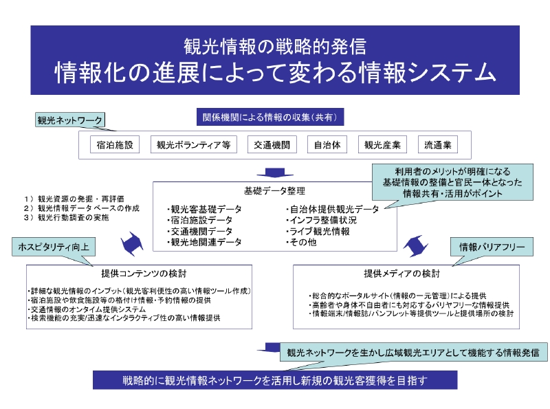 ネットワーク化へ向けたインフラ整備 観光ネットワークを構築し、これを円滑に運営していく上で、基礎データの整理がファーストステップとなるでしょう。 観光関連基礎調査 ・観光振興プログラムのテーマ及び基本方向に基づいて施策を展開してゆくために必要な基礎調査を行う必要があります。 1)観光資源の発掘・再評価 ・現在作成されているパンフレット等の資料が、観光資源の魅力が十分に拾い上げられているとはいえないかもしれません。 観光資源の発掘を行うために内容の見直しや改訂を行うことが必要です。 ・既に知られている資源であっても、例えば季節ごとに見れば別の魅力がある場合もあるので、観光客の興味の視点から観光資源の再評価を行う事が大切でしょう。 ・地元の人にとっては当たり前のものでも観光客にとっては興味を引かれるものもあるので、そのような観点を大事にして観光資源を活性化していくことも重要です。 2)観光情報データベースの作成 ・観光パンフレット・マップ、ホームページ等を作成する際の資料として、宣伝、プロモーション等に用いる素材として、また、市内の観光関係者や市民等が地域の観光資源等について知りたいときに利用する資料として、観光情報データベースを作成する事が必要です。 ・写真は有用な情報であり情報ニーズも高いので十分にストックする。季節毎の見栄えのする写真を集めておくなど日頃の情報収集整理は頻繁に行うべきです。 ・情報の収集にあたっては、上記の観光資源の発掘・再評価と合わせ、観光関係者に限らず、各地域に詳しい住民、その他関心の高い一般市民(公募等による)を活用する方法も検討しましょう。 3)観光行動調査の実施 ・観光客が観光地を訪れたきっかけや、利用した情報、立ち寄った観光施設、消費額と購入した土産品等、旅行中の不満点、問題点などについて数年に1度の頻度で調査する事は、新しいアプローチにとって重要なことです。 ・また、同じ観光資源でも季節毎の行動の違いも把握する事は必要でしょう。