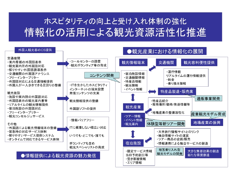 ホスピタリティの向上とネットワーク 旅行者に対する、CS創造の起点は各種インフラの整備による、ストレスのない行程や滞在、観光を提供する事にあるといえるでしょう。 旅行のスタートといえる空港や駅などから、交通機関や宿泊施設、観光施設など設備はもちろん、そこで働くスタッフの印象も大切になります。 特に言語の問題は大きな要因であり、適切なインフラの整備と、情報提供は絶対条件といえます。 観光ネットワークを基本として、各ポイントでバリアフリーの情報発信をすることは、資源そのものの集客パワーが弱いニューツーリズムにとっては大切なポイントといえます。 |